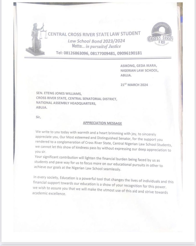 Indigent students of Cross River Central Senatorial District at the Nigeria Law Schools, have received a scholarship grant from the Senator representing the Central Senatorial District of the State, Distinguished Senator Eteng Jonah Williams.