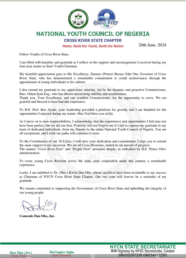Comrade Dan Obo, Jnr., the outgoing Chairman of the National Youth Council of Nigeria (NYCN) Cross River State Chapter, has expressed his gratitude to the Governor of Cross River State, Senator (Prince) Bassey Edet Otu, for his remarkable commitment to youth inclusiveness during his tenure.