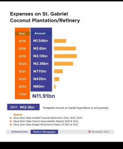 The state’s approved budget shows that N390 million was voted for the maintenance of infrastructure at the coconut refinery by the Ministry of Agriculture.in 2024.