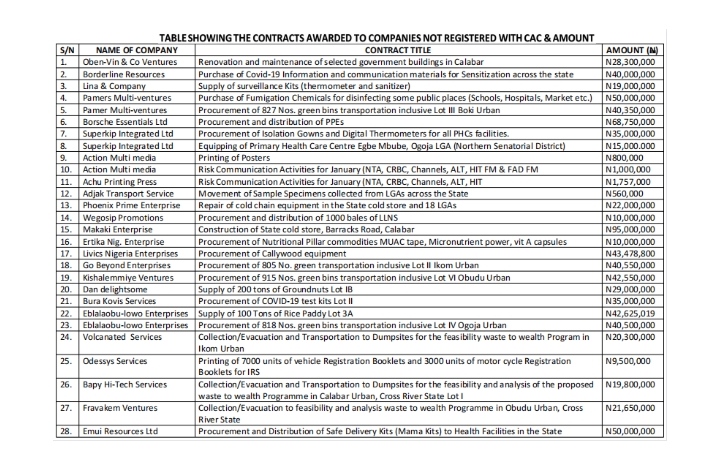 This six-week investigation also uncovered seven contracts awarded to four companies affiliated with politicians or Politically Exposed Persons, PEPs. Two are commissioners, one was an aide and relative to Governor Ben Ayade, and the other was a 2019 House of Assembly candidate cum popular radio presenter turned legislative aide.