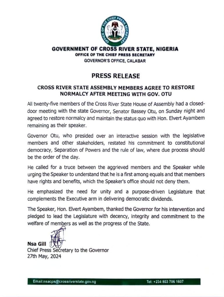 In a twist, all 25 members of the State House of Assembly have agreed to restore normalcy after a meeting with Governor, Sen. Bassey Edet Otu on Sunday night [27 May 2024].