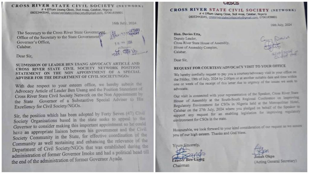 The letter, dated July 16, 2024, stresses the importance of reinstating the position which was previously established during the administration of former Governor Liyel Imoke but lapsed by the end of Governor Ayade’s term. The advocacy group believes that the appointment of a Special Adviser will facilitate a stronger liaison between the state government and civil society organizations, fostering a more robust environment for their operations and initiatives.