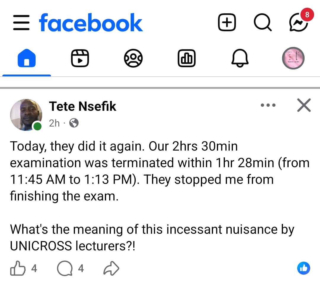 In a social media post shared on Tuesday, the student, identified as Tete Nsefik, stated that a two-hour, thirty-minute examination ended after only one hour and twenty-eight minutes. According to him, the exam, which began at 11:45 a.m., was stopped at about 1:13 p.m., preventing him from completing his work.